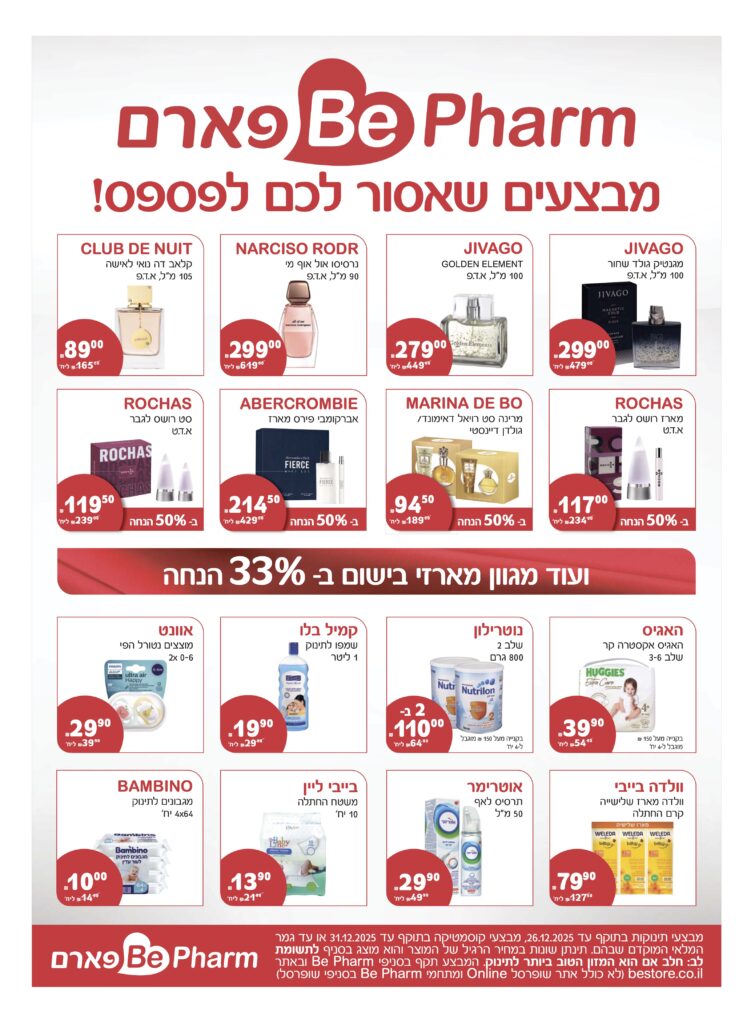 מבצעי תינוקת בתוקף עד 26.12.25, מבצעי קוסמטיקה בתוקף עד 31.12.2025 או עד גמר המלאי המוקדם שבהם. תינתן שונות במחיר הרגיל של המוצר והוא מוצג בסניף. מוגבל ל-2 מימושים ללקוח. המבצע תקף בסניפי Be Pharm ובאתר (לא כולל אתר שופרסל אונליין ומתחמי בי פארם בסניפי שופרסל). מתוך פרסום בעיתונות. באחריות Be. ט.ל.ח.
