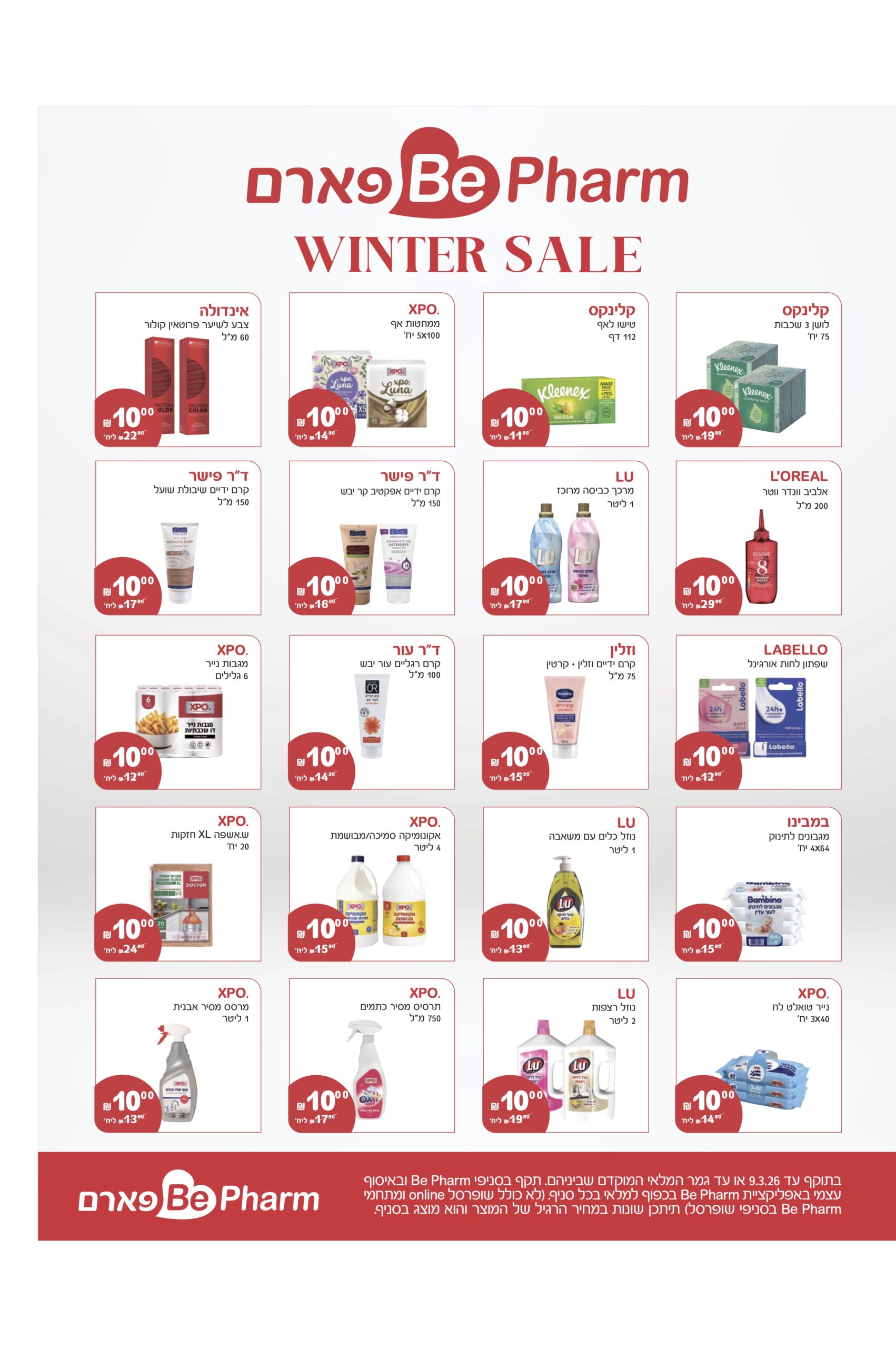 בתוקף עד 9.3.2026 או עד גמר המלאי המוקדם שבהם. תינתן שונות במחיר הרגיל של המוצר והוא מוצג בסניף. מוגבל ל-2 מימושים ללקוח. המבצע תקף בסניפי Be Pharm ובאתר (לא כולל אתר שופרסל אונליין ומתחמי בי פארם בסניפי שופרסל). מתוך פרסום בעיתונות. באחריות Be. ט.ל.ח.