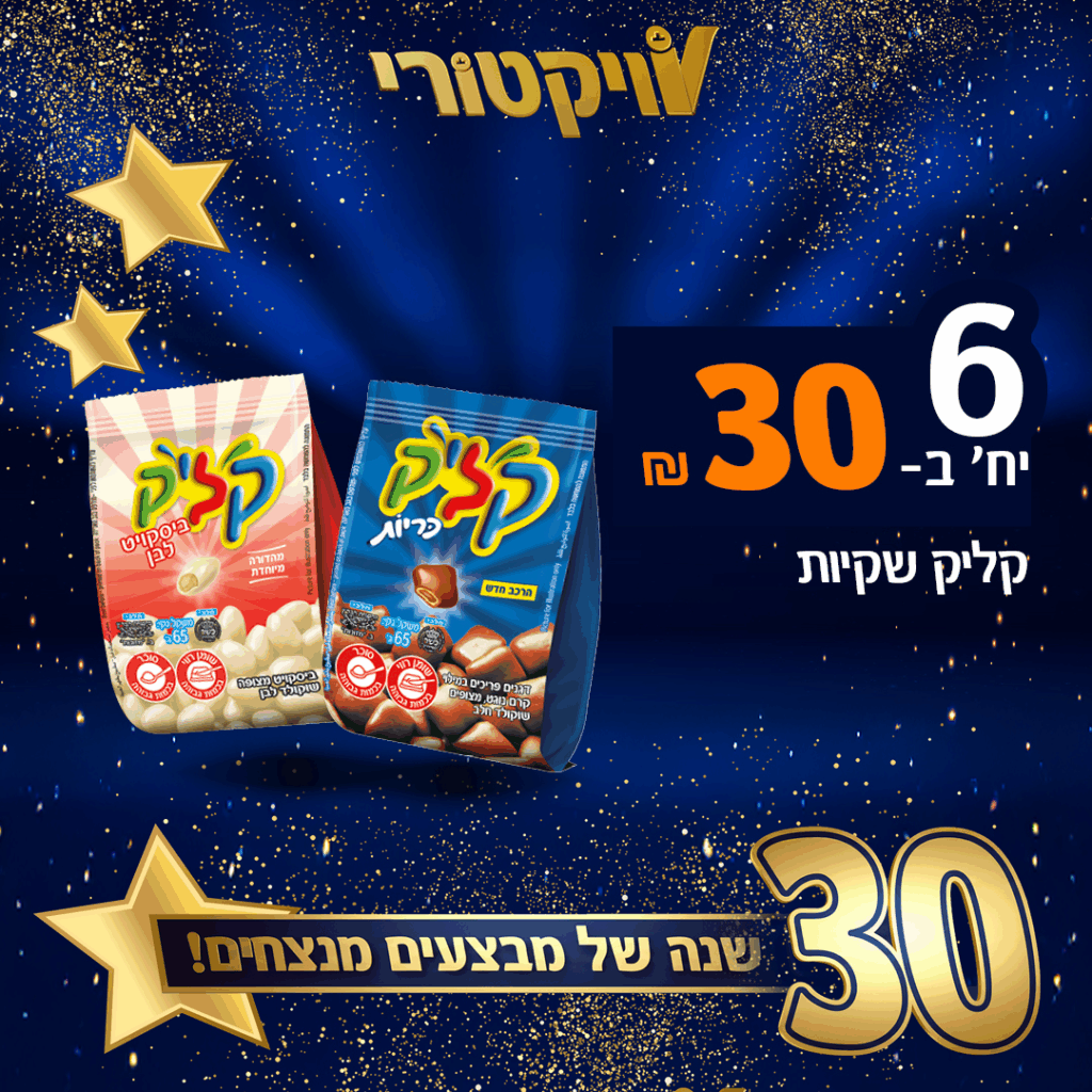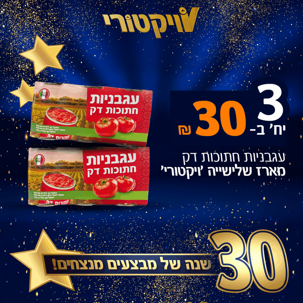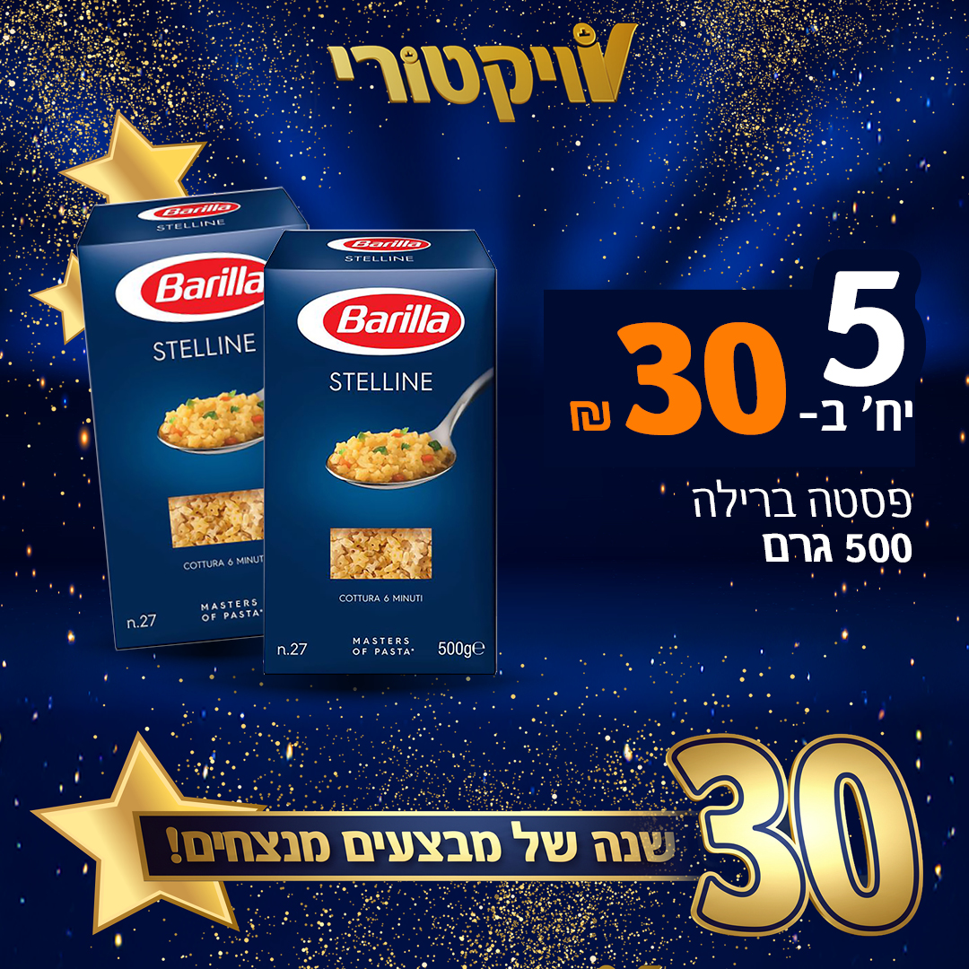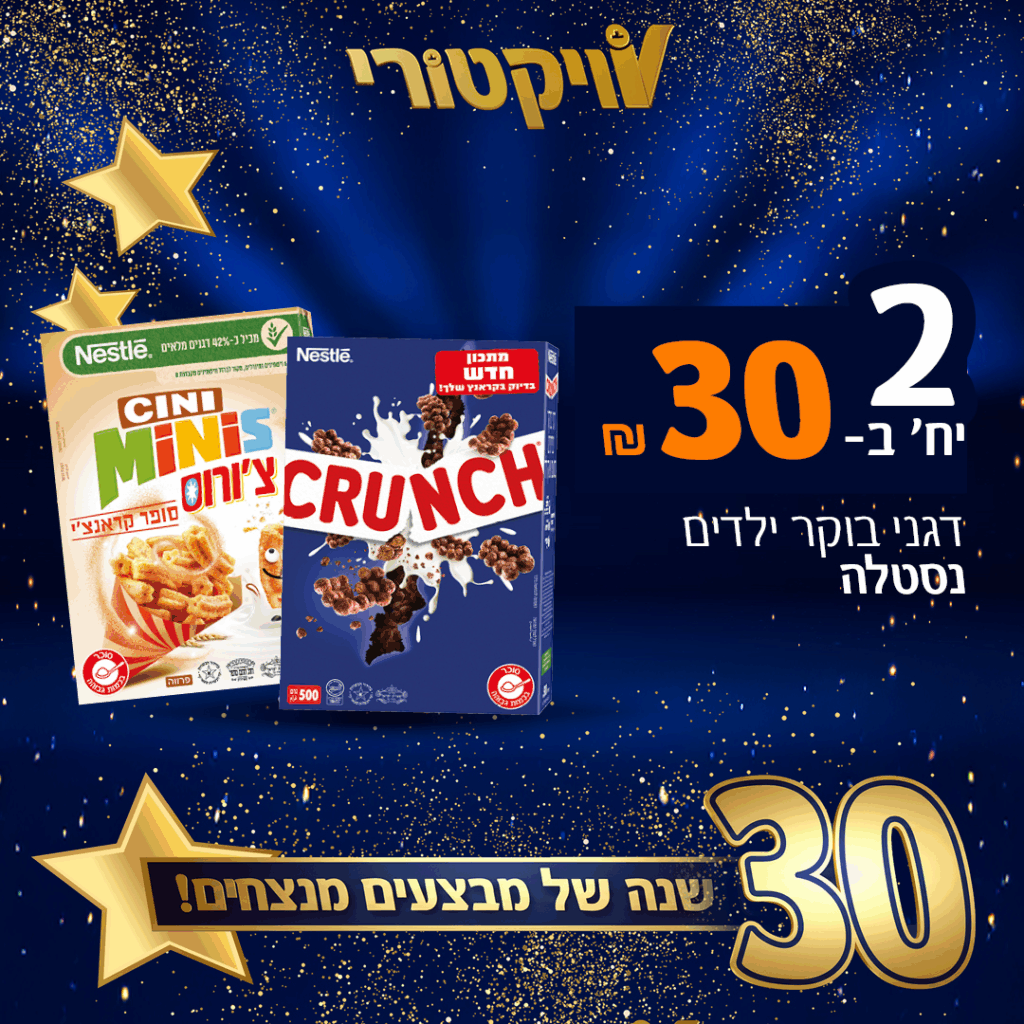 *המבצעים בתוקף עד התאריך 17.1.26 בלבד או עד גמר המלאי המוקדם מביניהם | מוגבל ל-2 יחידות/2 מימושים ללקוח | כפוף למגוון הקיים | אין מכירה סיטונאית | התמונות להמחשה בלבד | יתכן ומוצר שיסופק לצרכן נושא סימון תזונתי חדש ו/או סימון בסמל אדום, על אף שסימון כאמור אינו מופיע עדיין בפרסום זה | תיתכן שונות במחירי המוצרים לפני הנחה בסניפי הרשת, מחירם הקודם של המוצרים שבמבצע מוצג על המוצרים או בסמוך להם, בכל אחד מהסניפים והיה בתוקף לפחות יום אחד | מגוון הפריטים המשתתפים במבצע על פי הפירוט הקיים בסניף | הרשת שומרת לעצמה את הזכות להפסיק/לשנות את המבצעים בכל עת. ט.ל.ח