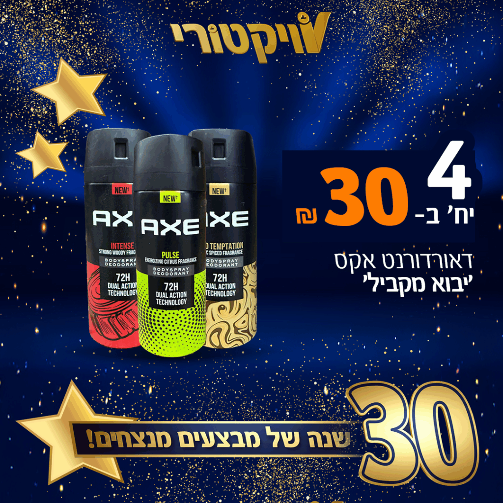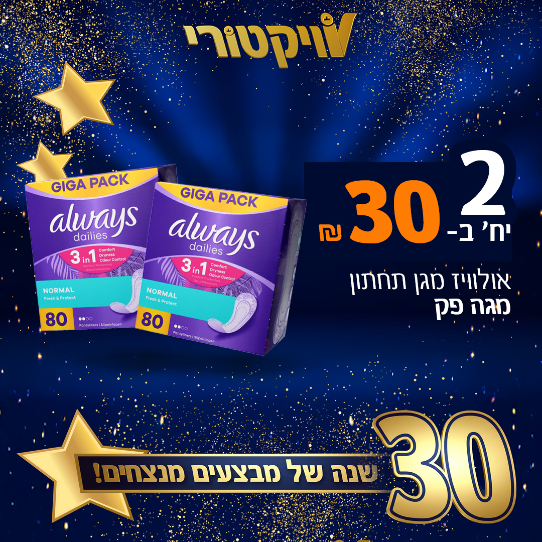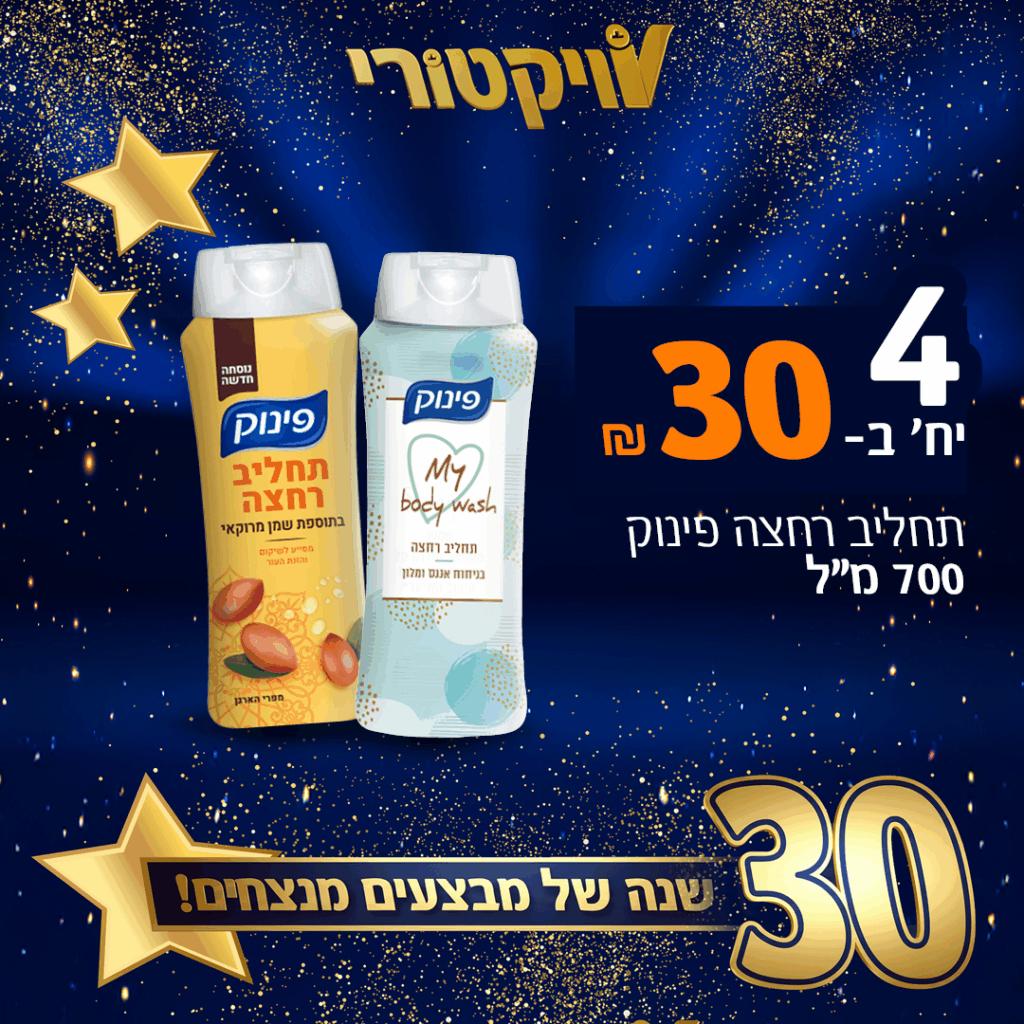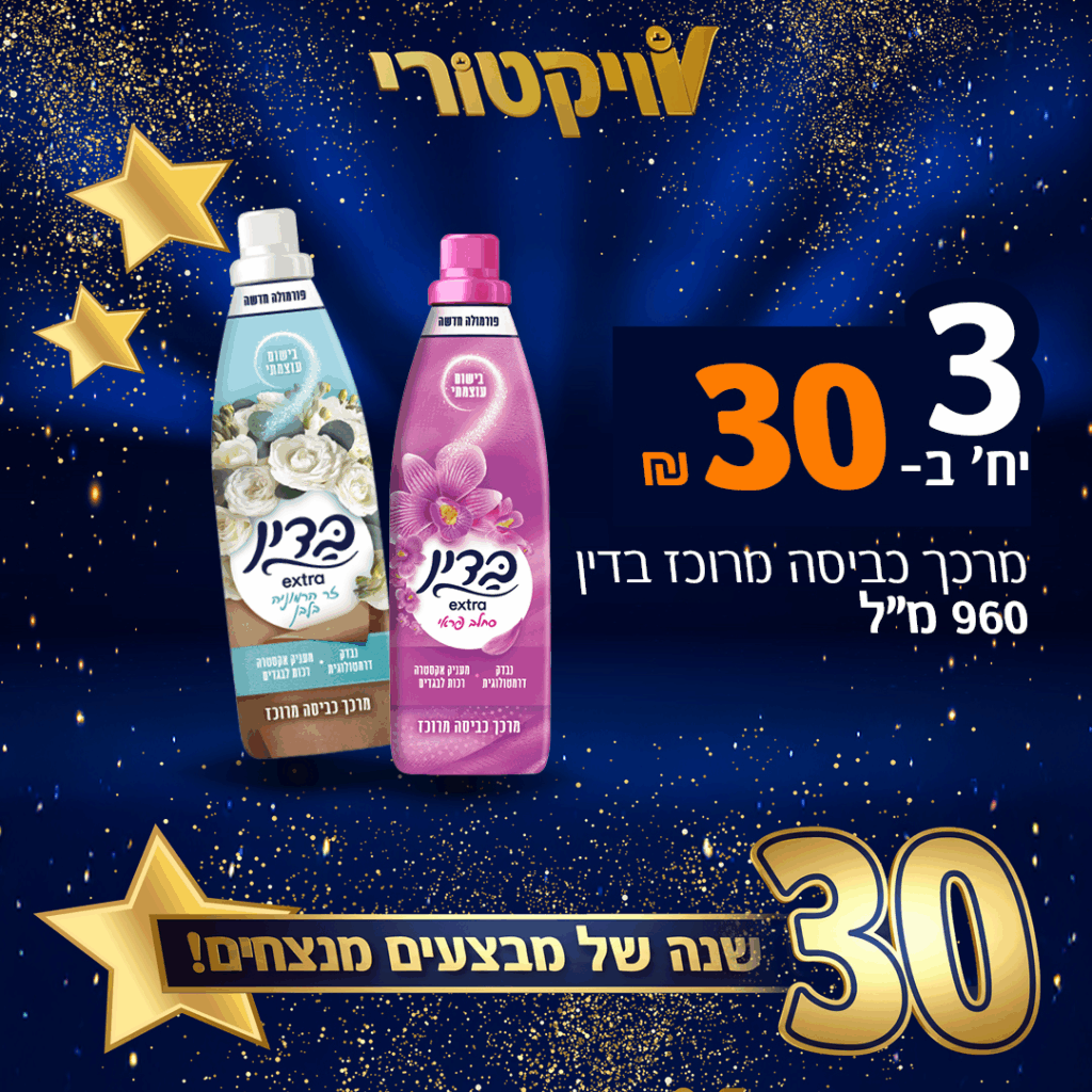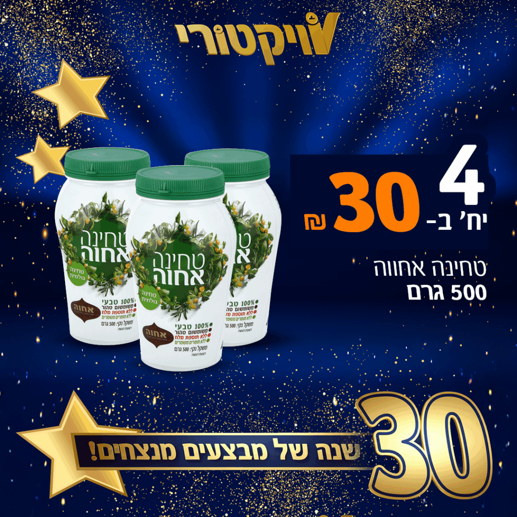*המבצעים בתוקף עד התאריך 17.1.26 בלבד או עד גמר המלאי המוקדם מביניהם | מוגבל ל-2 יחידות/2 מימושים ללקוח | כפוף למגוון הקיים | אין מכירה סיטונאית | התמונות להמחשה בלבד | יתכן ומוצר שיסופק לצרכן נושא סימון תזונתי חדש ו/או סימון בסמל אדום, על אף שסימון כאמור אינו מופיע עדיין בפרסום זה | תיתכן שונות במחירי המוצרים לפני הנחה בסניפי הרשת, מחירם הקודם של המוצרים שבמבצע מוצג על המוצרים או בסמוך להם, בכל אחד מהסניפים והיה בתוקף לפחות יום אחד | מגוון הפריטים המשתתפים במבצע על פי הפירוט הקיים בסניף | הרשת שומרת לעצמה את הזכות להפסיק/לשנות את המבצעים בכל עת. ט.ל.ח